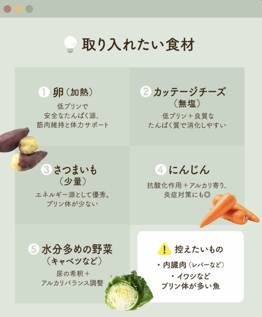 プリン体が少ない卵やカッテージチーズは、安全なタンパク源として重宝します。また、エネルギー源として役立つさつまいもや、抗酸化作用のあるにんじんも良い選択肢です。
