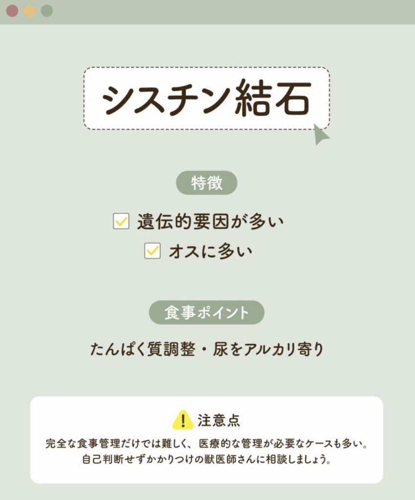 シスチン結石は遺伝的な要因が強く、特にオスの犬に多く見られる珍しい種類の結石です。アミノ酸の一種であるシスチンの代謝に問題があることで発生し、医療的な管理が必要になるケースも珍しくありません。