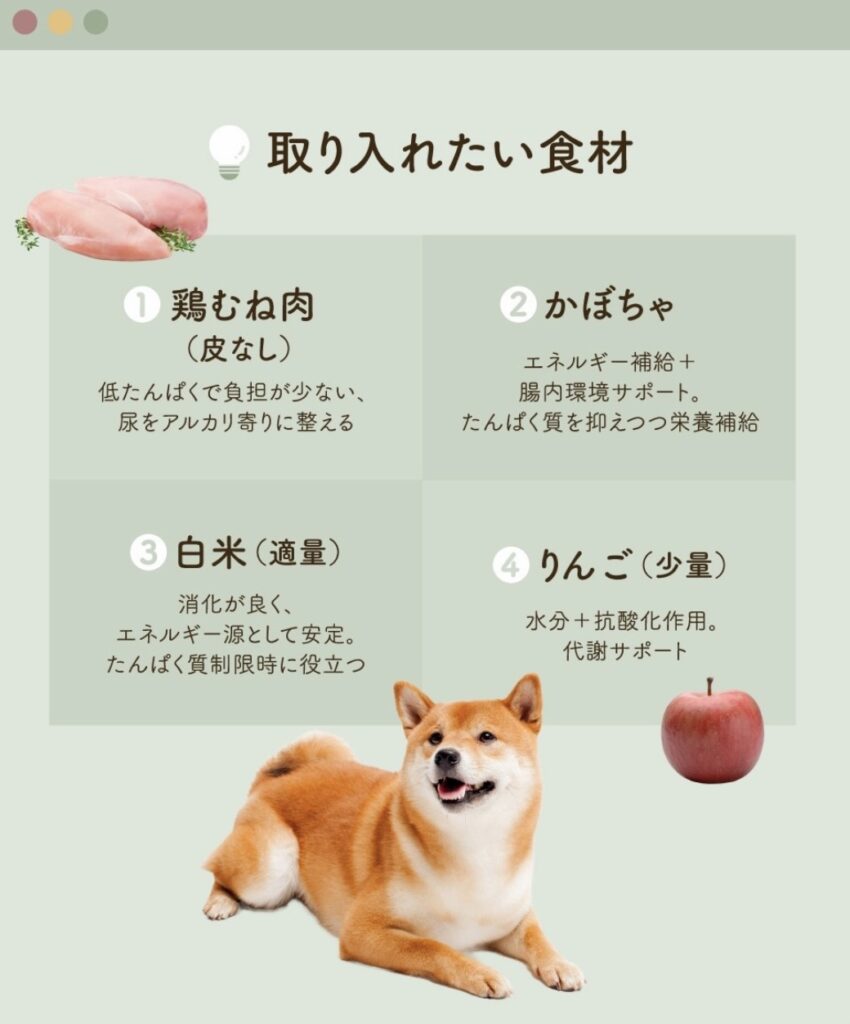 低タンパクで内臓への負担が少ないキャベツやかぼちゃがおすすめです。これらの野菜は尿のpHを整えるのにも役立ちます。消化が良くエネルギー補給に優れた白米を適量加え、全体的なタンパク質バランスを調整しましょう。