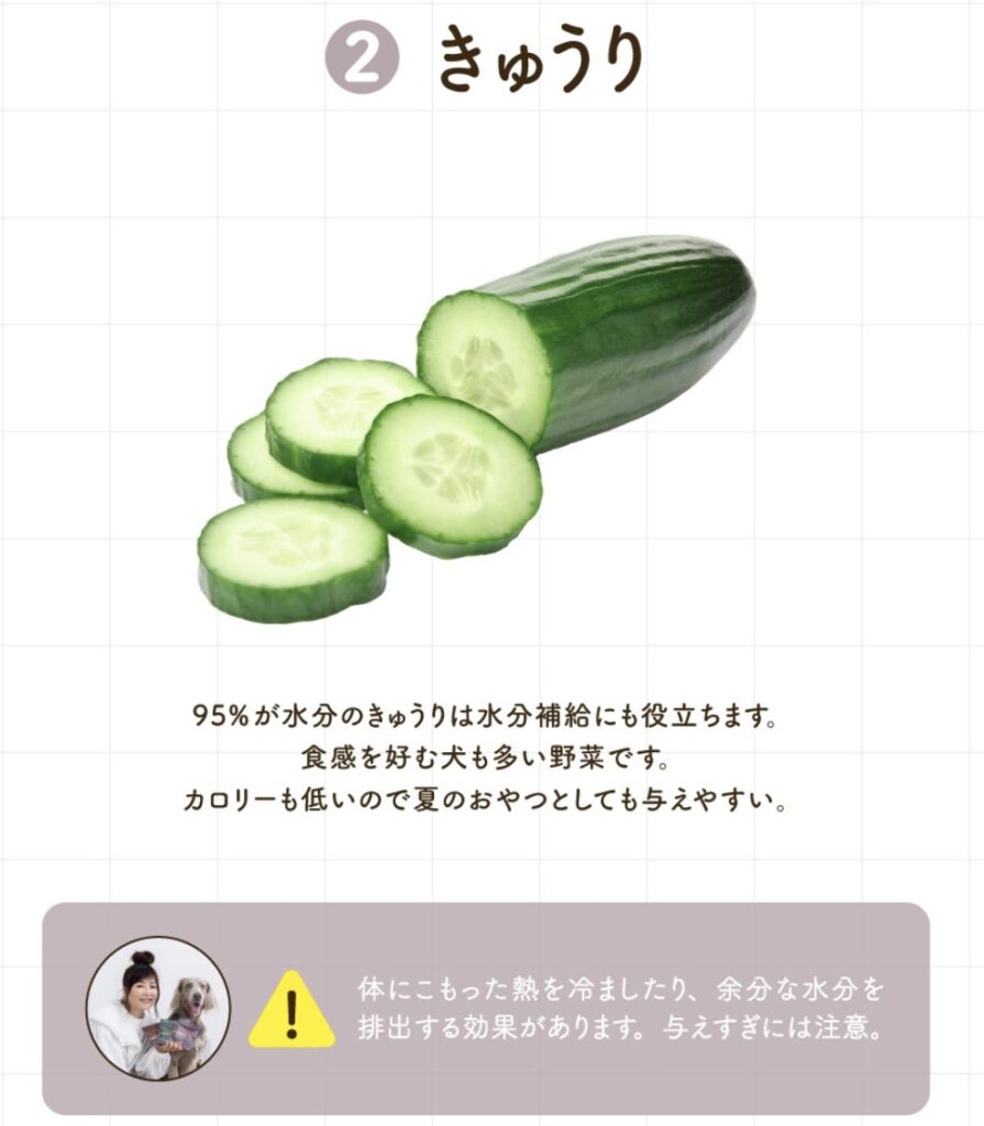 95%が水分のきゅうりは水分補給にも役立ちます。食感を好む犬も多い野菜です。カロリーも低いので夏のおやつとしても与えやすい。