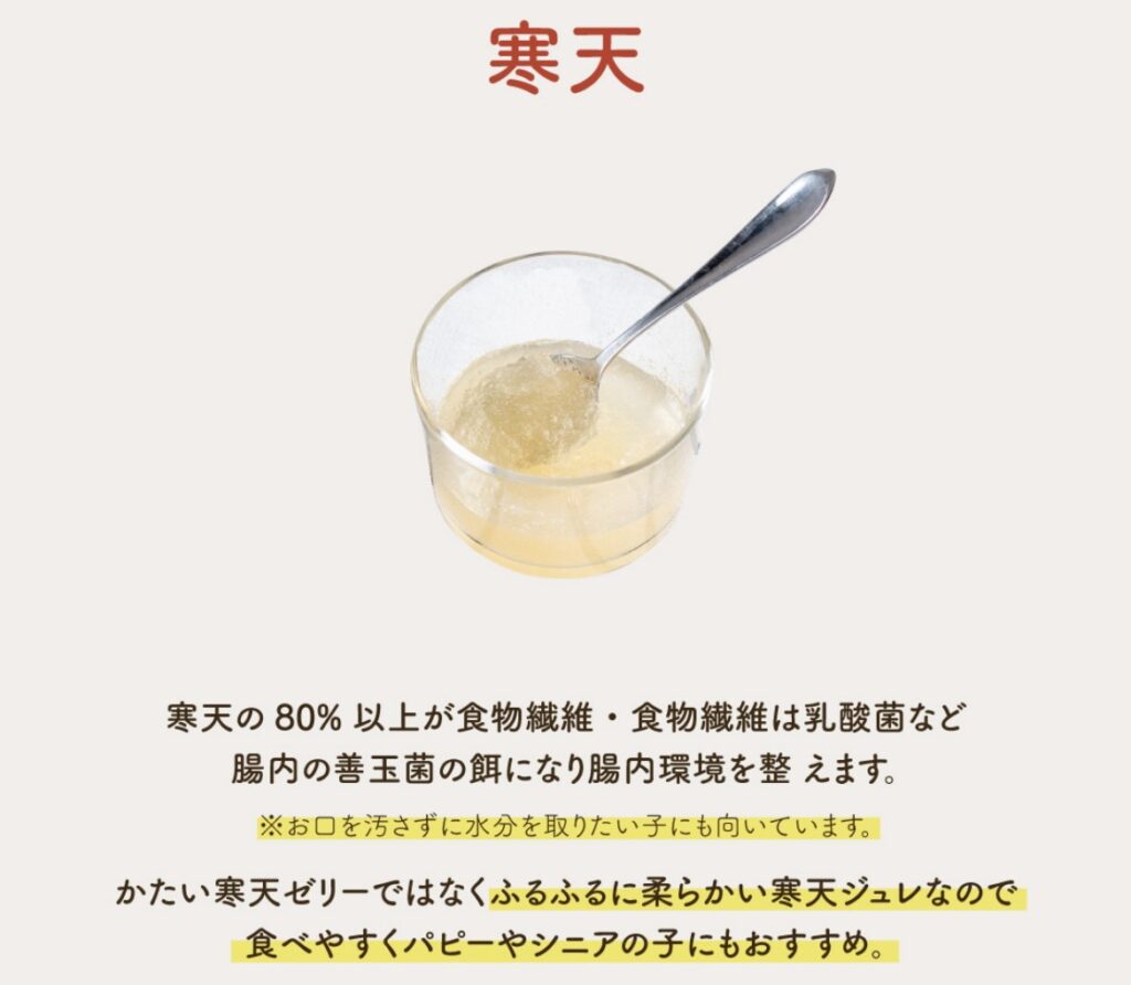寒天の80%以上が食物繊維・食物繊維は乳酸菌など腸内の善玉菌の餌になり腸内環境を整えます。かたい寒天ゼリーではなくふるふるに柔らかい寒天ジュレなので食べやすくパピーやシニアの子にもおすすめ。
