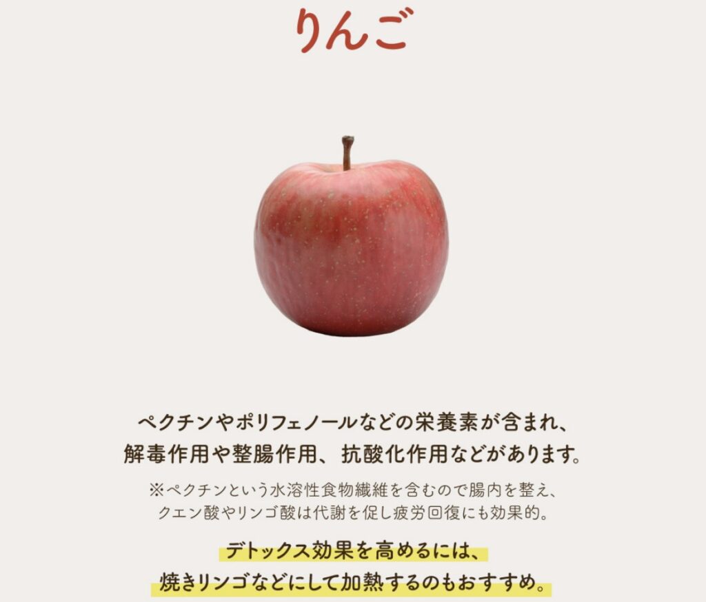 ペクチンやポリフェノールなどの栄養素が含まれ、解毒作用や整腸作用、抗酸化作用などがあります。デトックス効果を高めるには、焼きリンゴなどにして加熱するのもおすすめ。