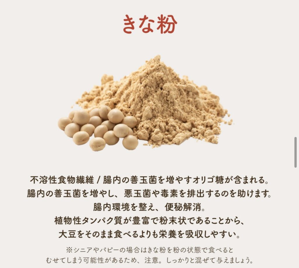 ※シニアやパピーの場合はきな粉を粉の状態で食べるとむせてしまう可能性があるため、注意。しっかりと混ぜて与えましょう。